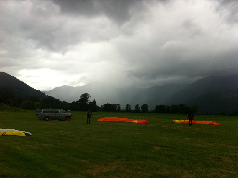 | ![]() Agassiz BC Thunderstorms likely. High 14C. Winds SW at 10 to 15 km/h. Chance of rain 80%. Temperature steady near 12. 1500 metres We actually got a window around 11 am, so we headed up to Woodside Launch and were offered up nice launch conditions and lots of cloud suck for them to practice "big ears and speed bar". I encouraged them to get down below the clouds as it look like rain to the SW, and sure enough on the drive down it started raining heavily on the mountain but not much in the valley. Only Yves got his wing wet, but we did lay out all the wings to make sure they were dry for travel. Congratulations to both Doug & Matt for achieving the P-2 in a week of flying, lots of travel miles and hard work but they are leaving confident and they are flying very well! ![]() Drone Warning over Bridal Falls - a commercial film company is doing a drone shoot near Bridal Falls but they expect to be finished by 3 pm on June 15th. Watch out for them if you plan to fly earlier. 6-13-16